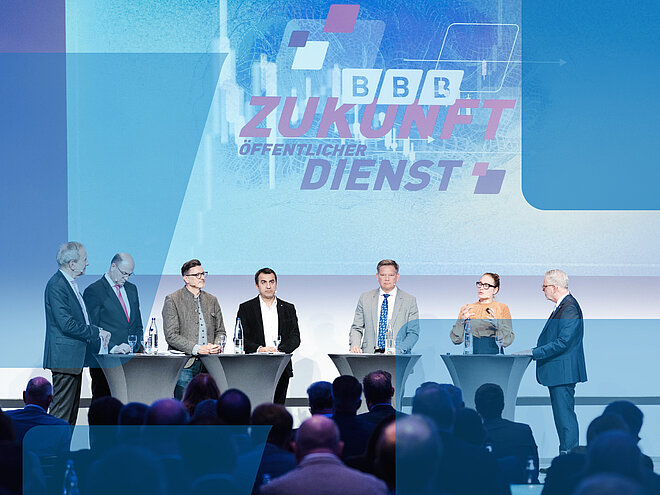 Moderator Tilmann Schöberl bat zur Gesprächsrunde neben Finanzminister Albert Füracker, MdL, die Sprecher für den öffentlichen Dienst der Parteien Alfred Grob, MdL (CSU), Dr. Martin Brunnhuber, MdL (Freie Wähler), Julia Post, MdL (Bündnis 90 / Die Grünen), Arif Taşdelen, MdL (SPD) und Rainer Nachtigall auf die Bühne. Erörtert wurden u. a. die Rentenvorschläge von Bundessozialministerin Bas, die aktuellen Entbürokratisierungsbestrebungen und Zukunftsprojekte wie Digitalisierung und Künstliche Intelligenz.
